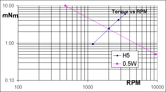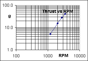 We plan to do a set of measures in a wind tunnel. Preliminary tests have shown that for the speed we are concerned for very slow flyers, the change is less than 10% at 1.6 m/s. Propeller plotsThe important parameters are the trust and the power. We need also the torque and the rotation speed (RPM) in order to understand the matching of the propeller and the motor. E.g, for propeller #5 (Wes Technik 16/12, 160mm, 1.35g), our measure gives three interesting plots. The thrust vs RPM is in theory a straight line (on the log plot) of slope